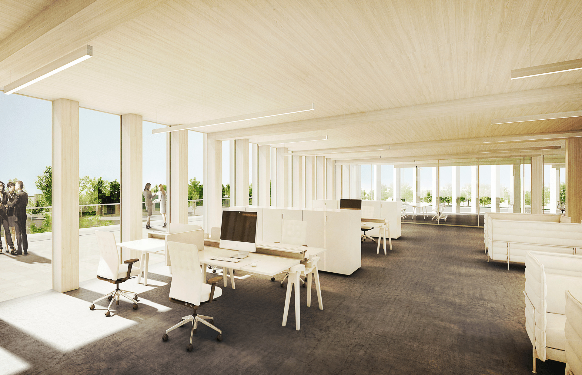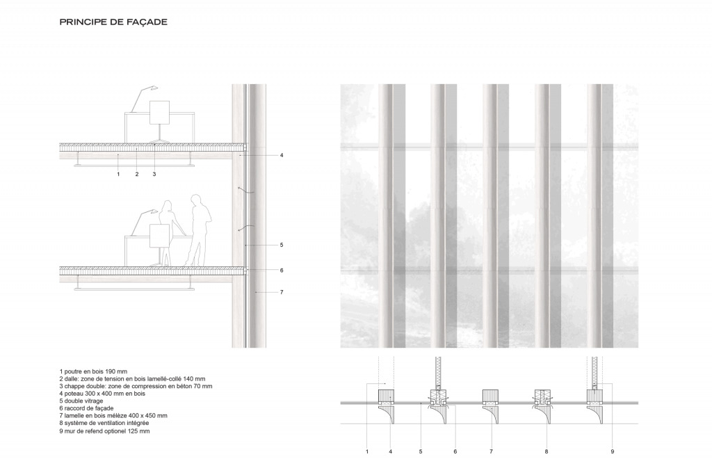 [EN] We are designing an innovative and attractive office building. Oriented towards the Seine to optimise the view of the river for users, it will make a strong impression on its environment through its highly original shape. Adapted to the ecological needs of today and tomorrow, but also to the transformations in working methods, this building is totally flexible in its layout, notably thanks to its ecological and sustainable structure. By favouring natural light and opting for a large presence of wood both inside and outside, for the vertical sunshades, we want the building to diffuse a warm and pleasant working atmosphere.