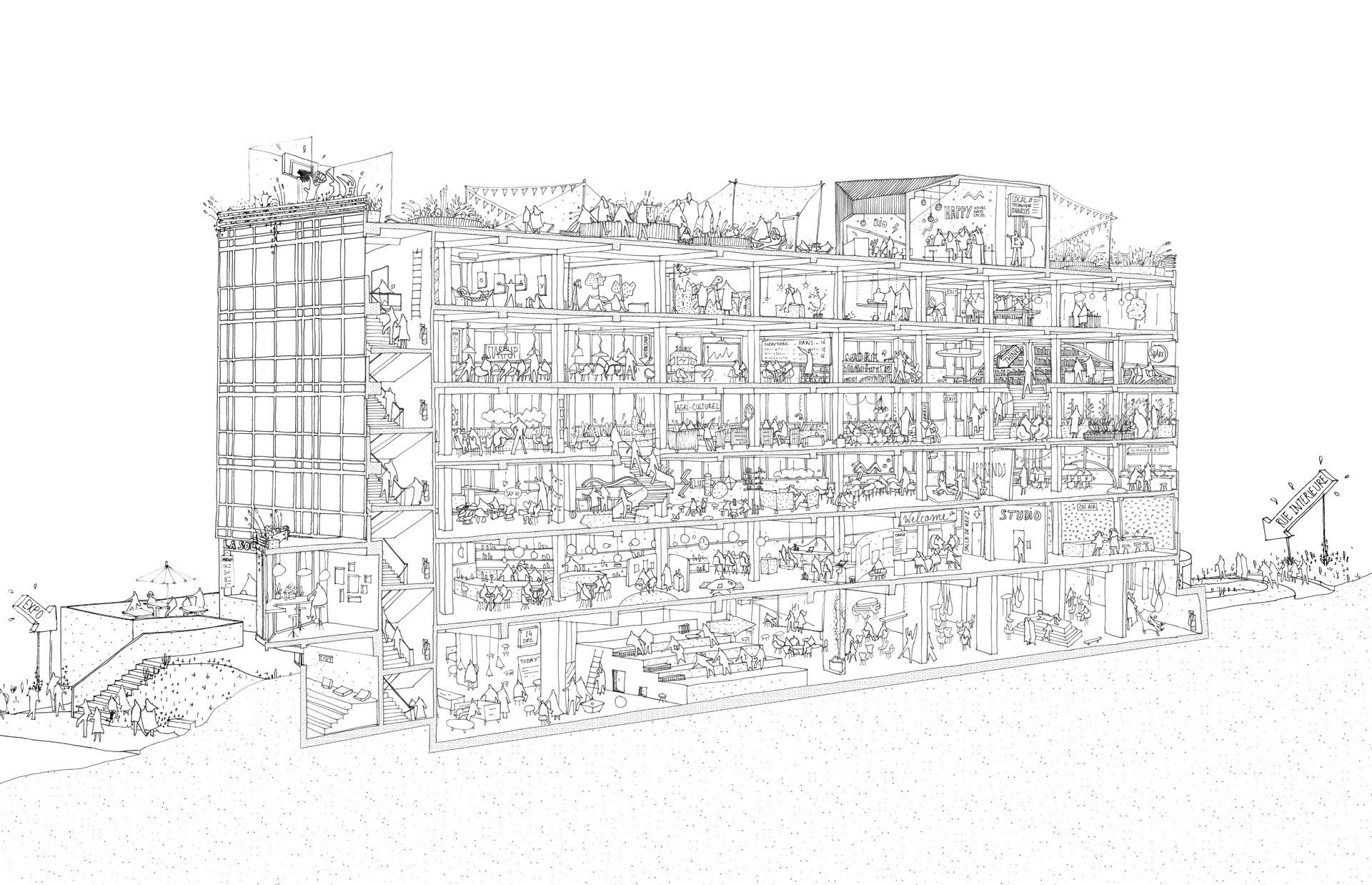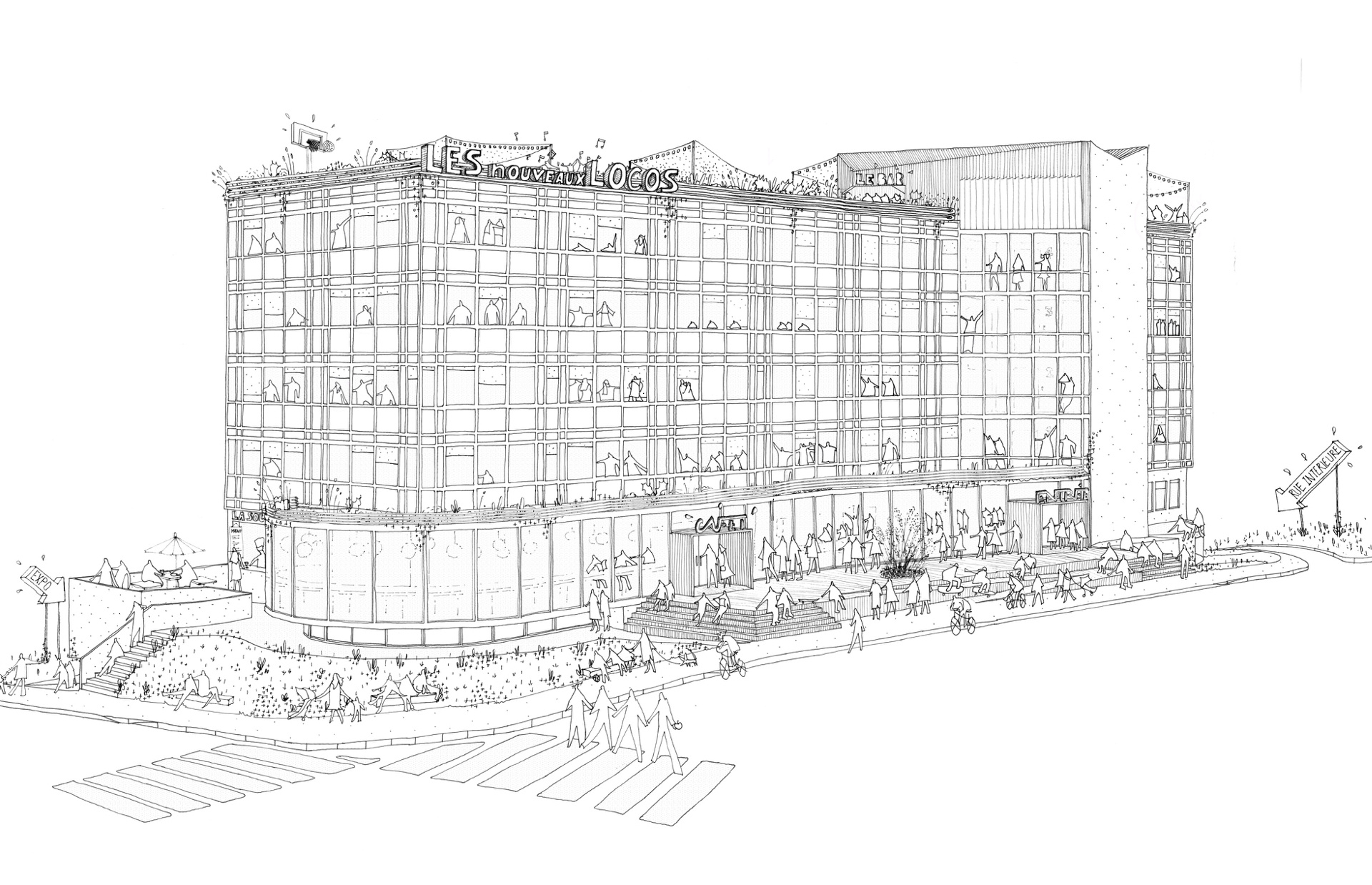 [EN] A space for expression and experimentation the project, winner of the “Prefiguring” section of the PLAY GROUES consultation launched by EPADESA in May 2016, will take root in the heart of the future Groues district in Nanterre. Designed as a “Third Place” open to the city, its inhabitants and its actors, LES NOUVEAUX LOCOS will host from 2018 a diversity of activities that renew and question the place of culture in our daily lives. At the origin of the project is the architectural firm HEINRICH VON SPONECK, which has taken up the issue of urban renewal by associating itself with those who act in the area through their daily activities. Thus the promoter/investor AVENTIM joins the adventure alongside the three future managers of the site: CRÉATURE for the accompaniment of cultural entrepreneurship, L’OPERATORIUM for professional and amateur artistic practices and LA LUNE ROUSSE for the restoration and the event programming.