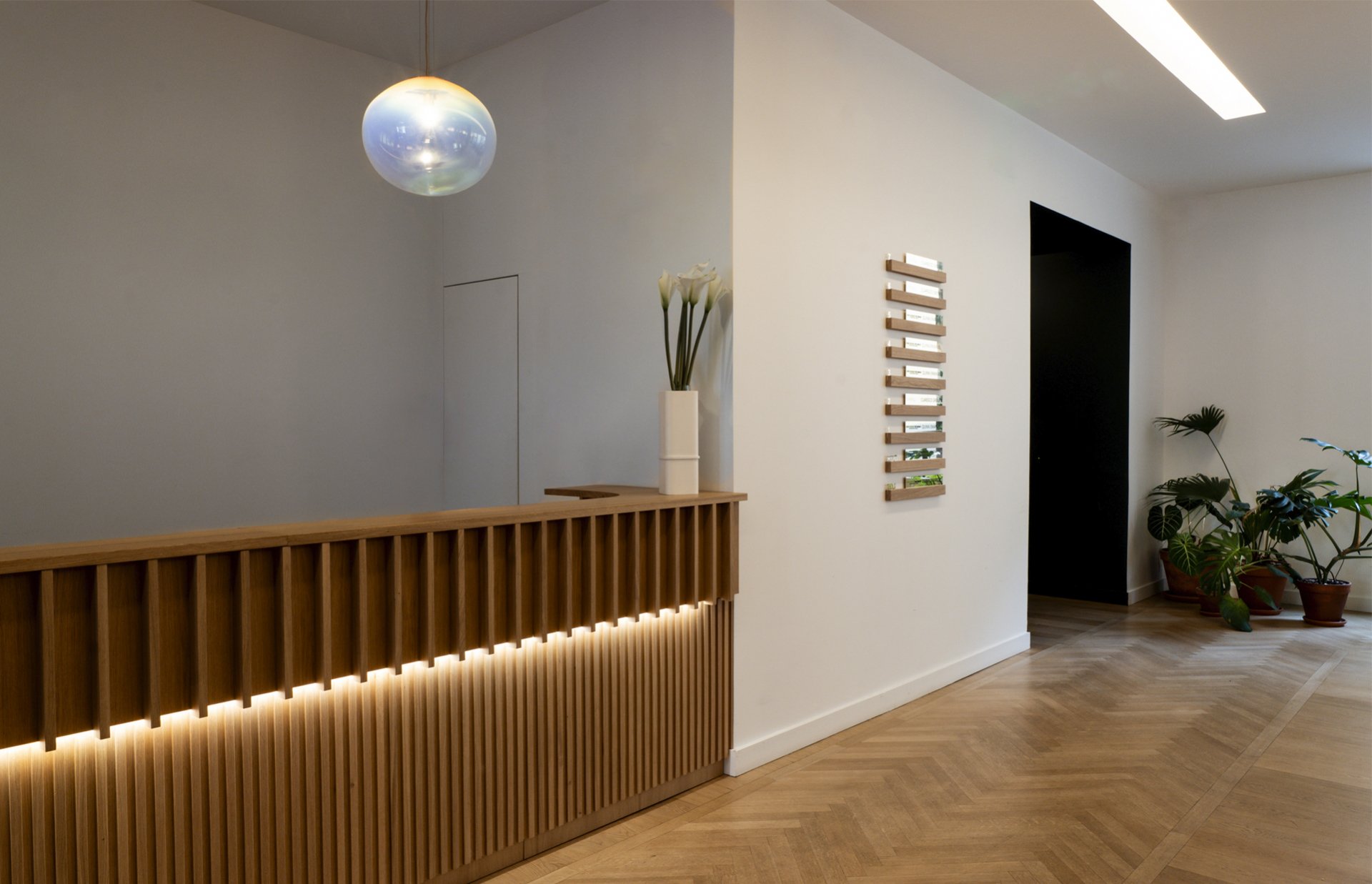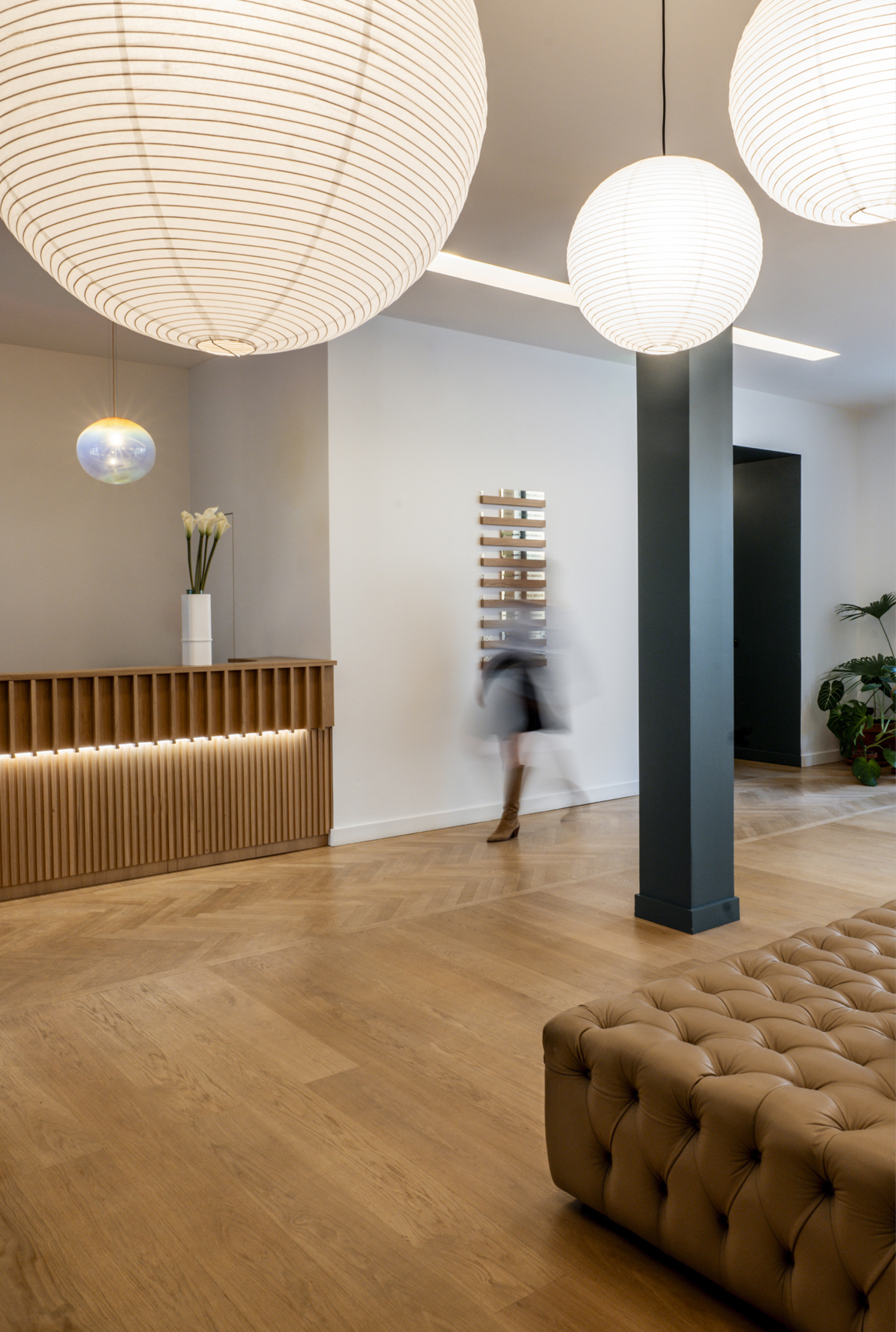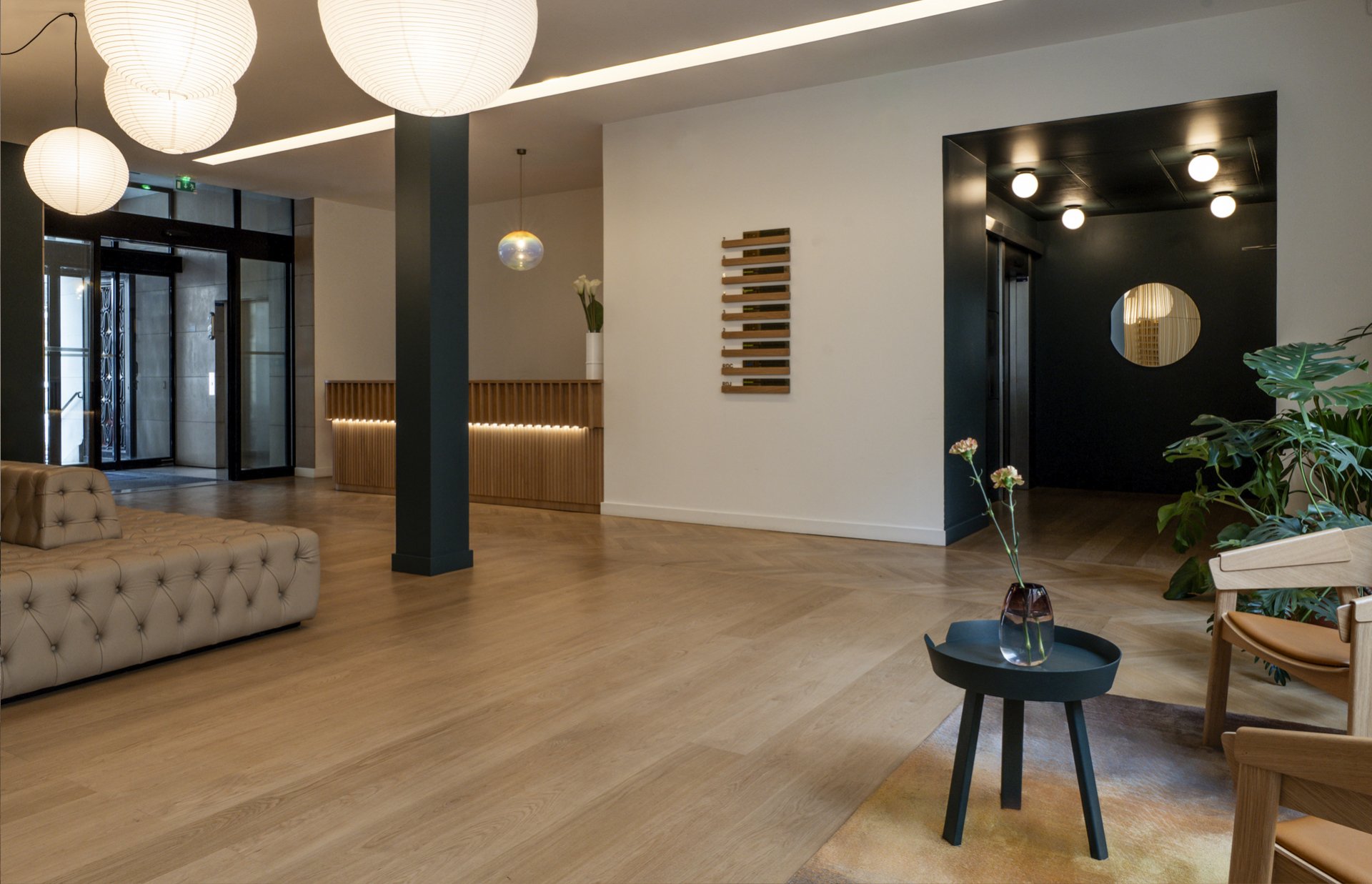 [FR] Relook du hall d’entrée d’un immeuble de bureaux dans le 8ème arrondissement de Paris – création d’une fresque murale qui reflet les mouvements et la lumière naturelle qui rentre du patio, réalisée par peintre artiste Bruno Romette. Les matières naturelles comme le bois et le papier de riz, la végétation et les couleurs d’orée et bleu foncé créent un ensemble agréable et détendu.