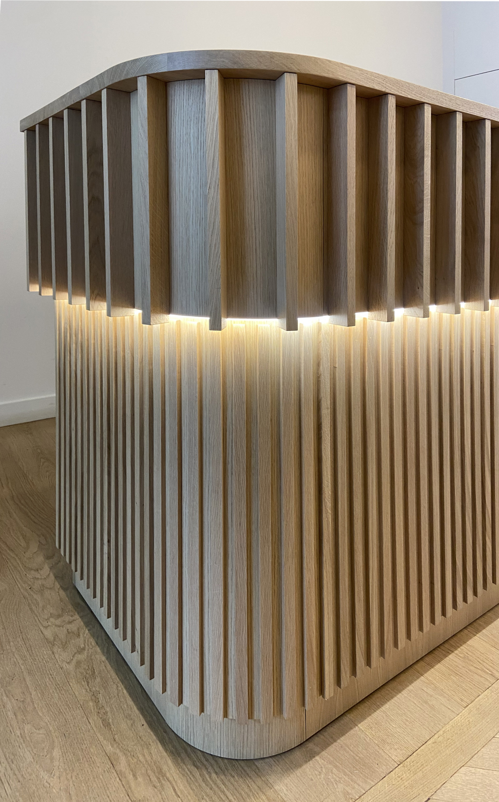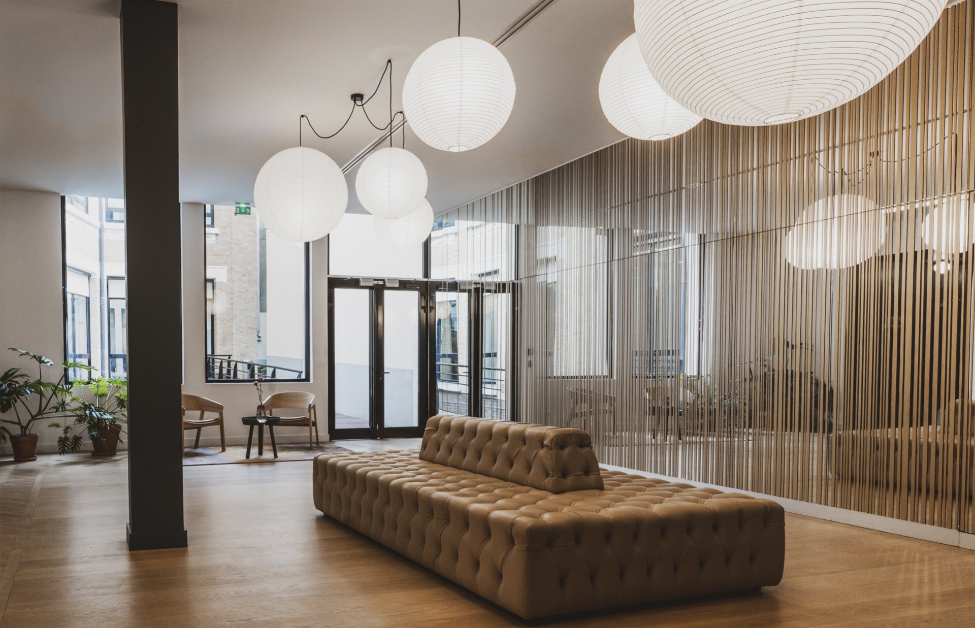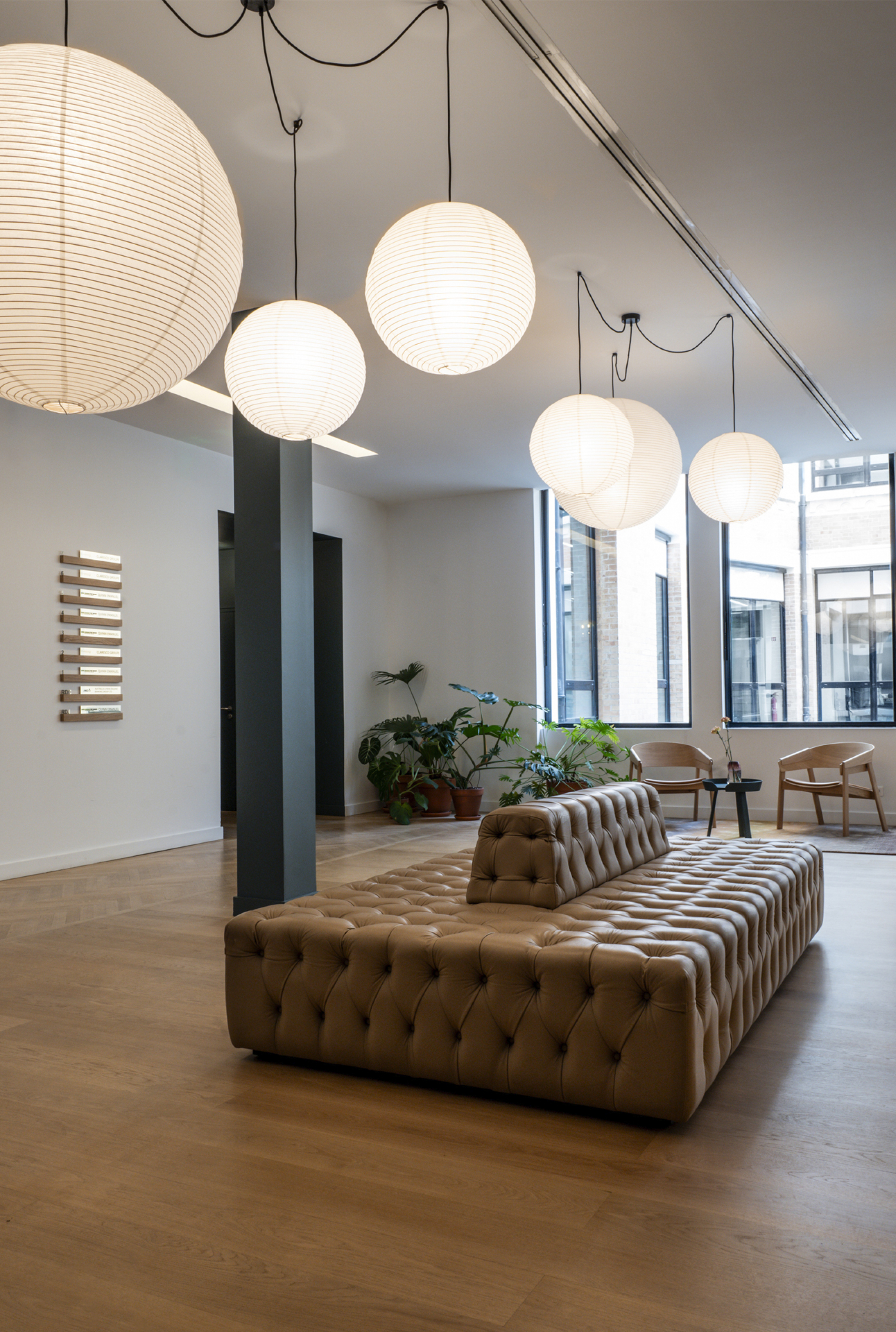 [FR] Relook du hall d’entrée d’un immeuble de bureaux dans le 8ème arrondissement de Paris – création d’une fresque murale qui reflet les mouvements et la lumière naturelle qui rentre du patio, réalisée par peintre artiste Bruno Romette. Les matières naturelles comme le bois et le papier de riz, la végétation et les couleurs d’orée et bleu foncé créent un ensemble agréable et détendu.