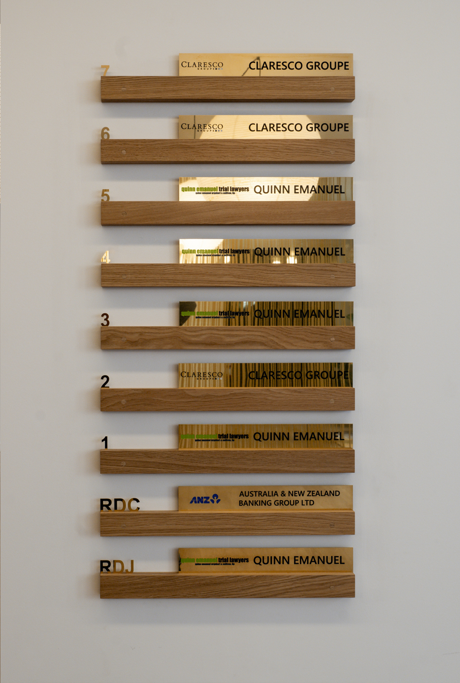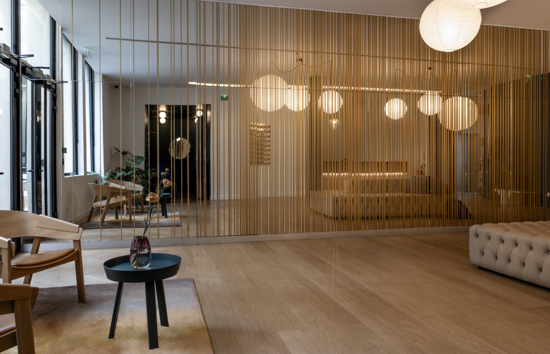 [FR] Relook of the entrance hall of an office building in the 8th arrondissement of Paris – creation of a mural reflecting the movements and natural light coming in from the patio, realised by artist painter Bruno Romette. Natural materials such as wood and rice paper, the vegetation and the colours of gold and dark blue create a pleasant, relaxed atmosphere.
