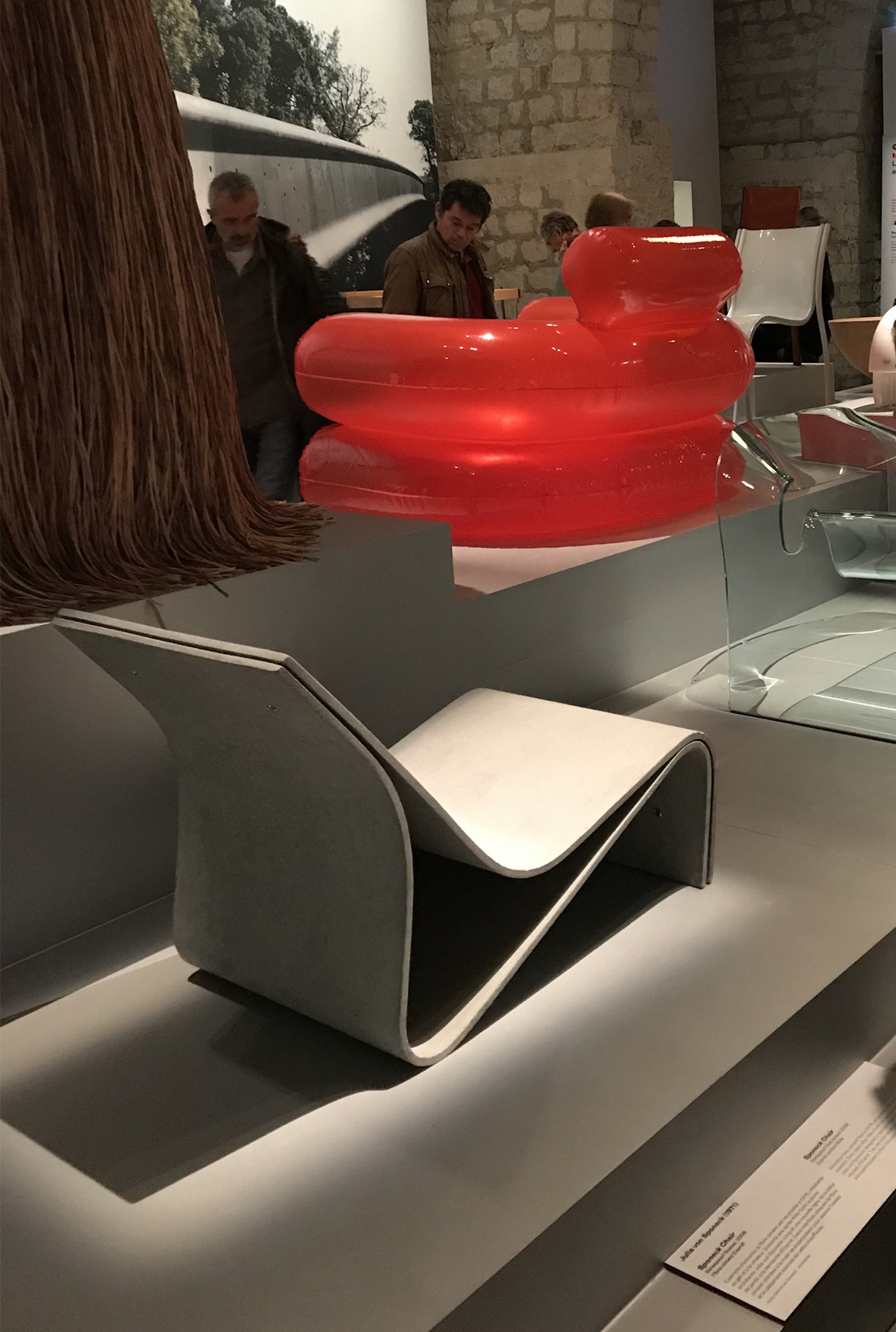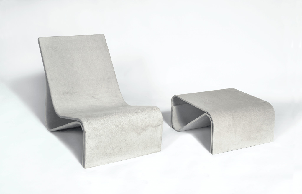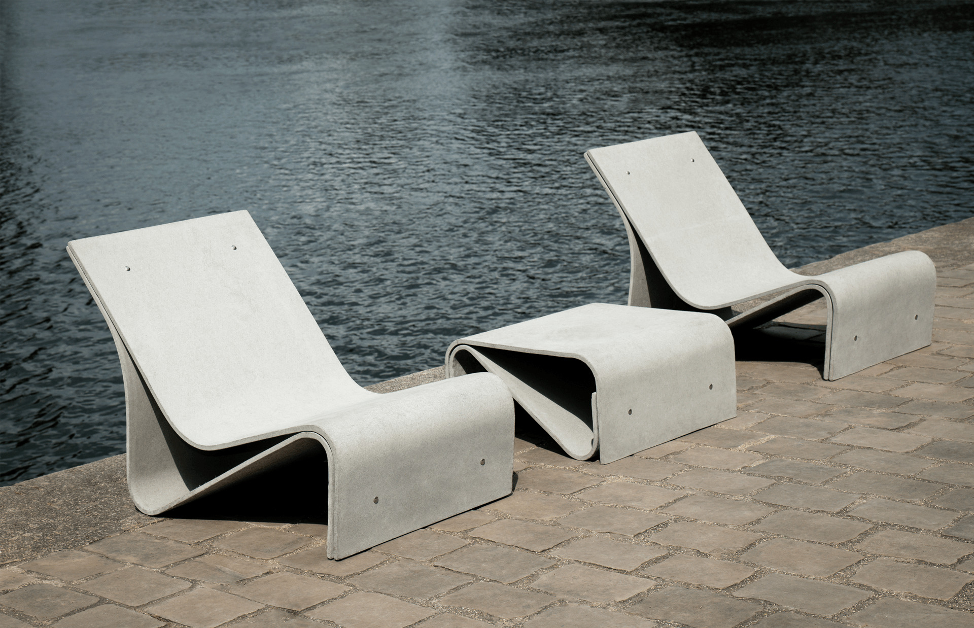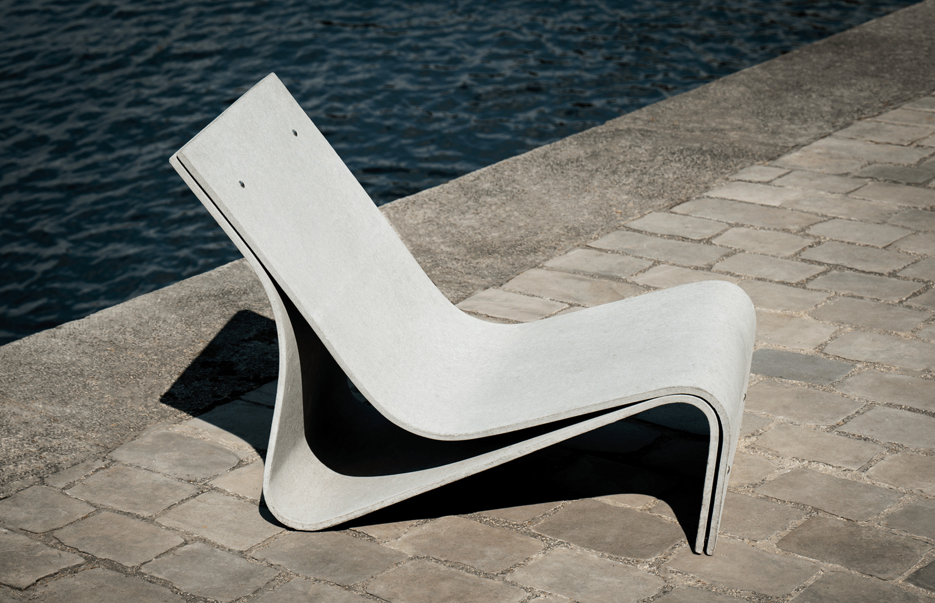 [EN] Two layers of fibre cement gently curved against each other build a static yet elastic system. Made out of water, cement and paper fibre the material has a soft cardboard like touch and is water and frost resistant, which makes it perfect for an outdoor use. The chair is part of the exhibition “Architects furniture 1960-2020” at the Cité de l’architecture & du patrimoine, Paris.
