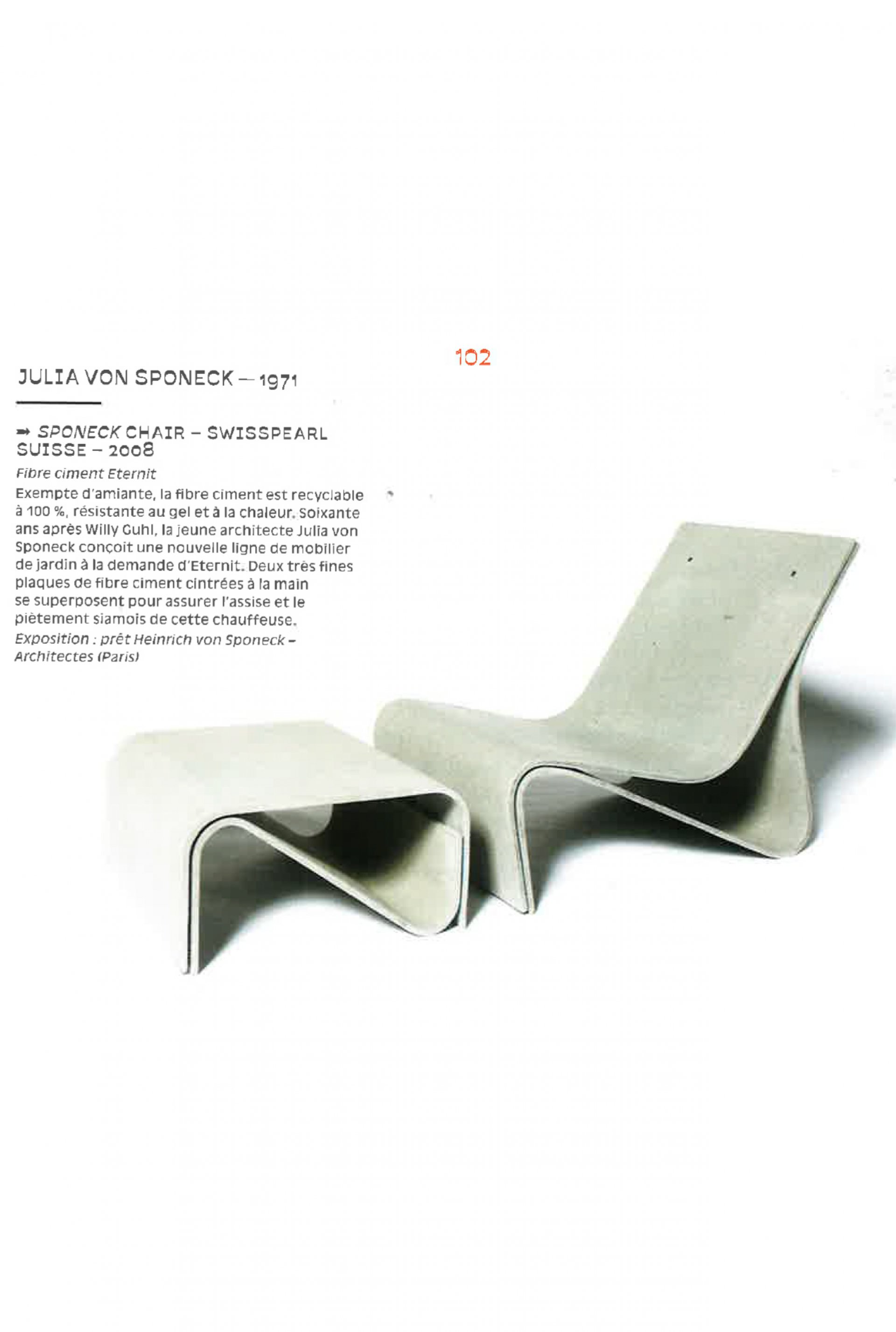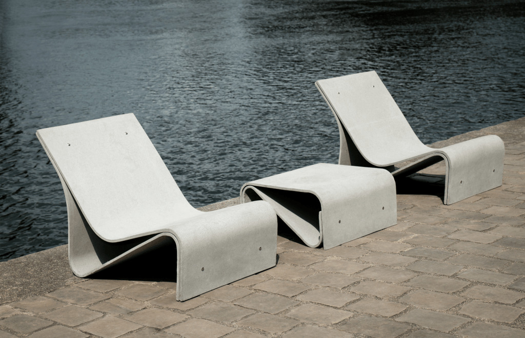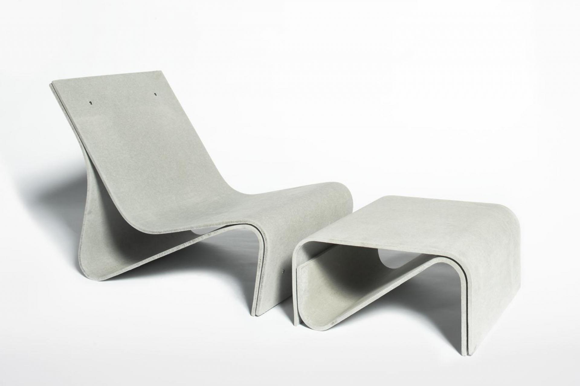 [FR] Deux couches de fibre ciment légèrement courbées l’une contre l’autre forment un système statique mais élastique. Fabriqué à partir de fibres d’eau, de ciment et de papier, le matériau a un toucher doux comme du carton et résiste à l’eau et au gel, ce qui le rend parfait pour une utilisation en extérieur. La chaise fait partie de l’exposition «Le mobilier d’ architectes 1960-2020» à la Cité de l’architecture & du patrimoine, Paris.